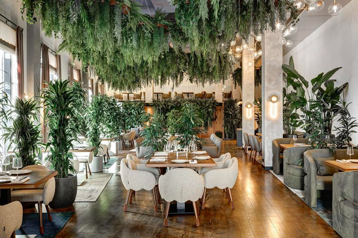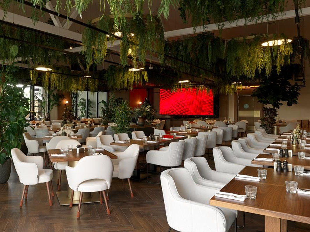 Малый зал – для камерных встреч и спокойного отдыха, более темных тонов, он утопает в зелени и создает ощущение вечного лета- вместимость до 100 персон.