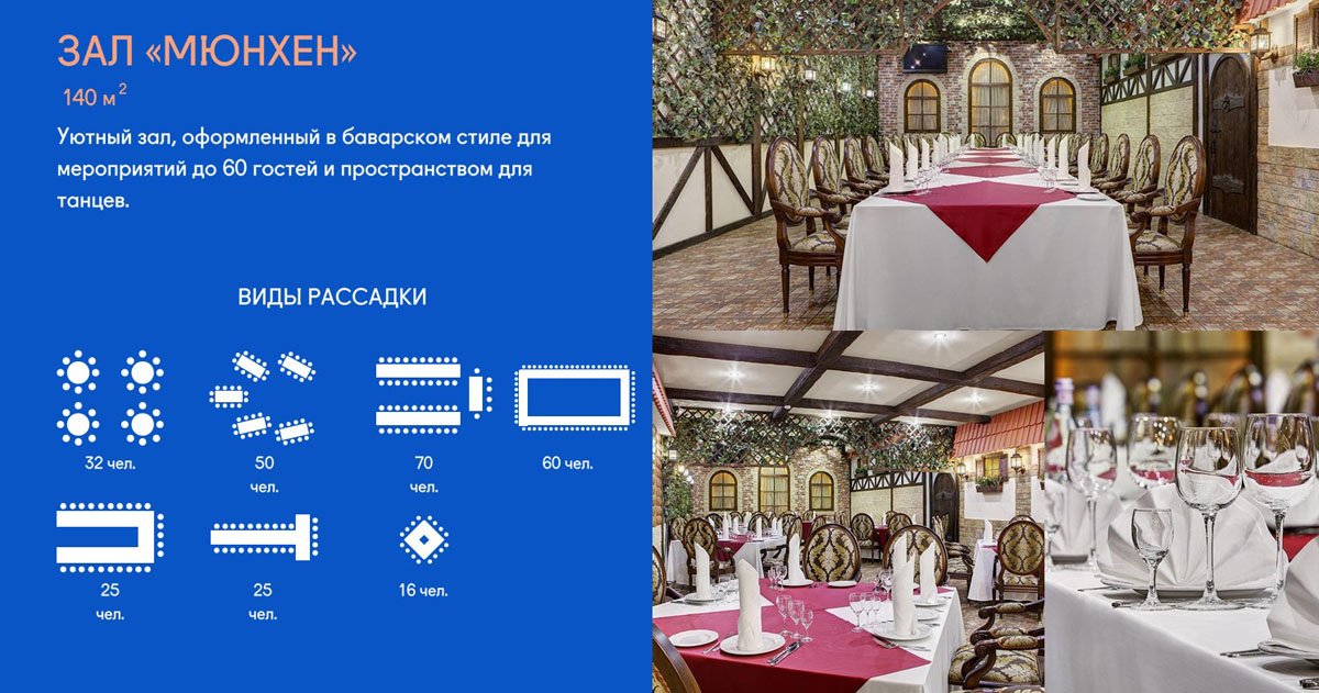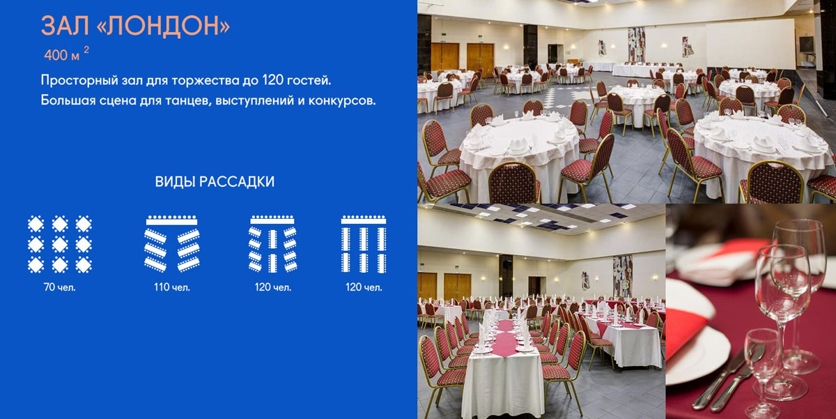 Залы рассчитаны для банкетов от 50 до 150 персон.