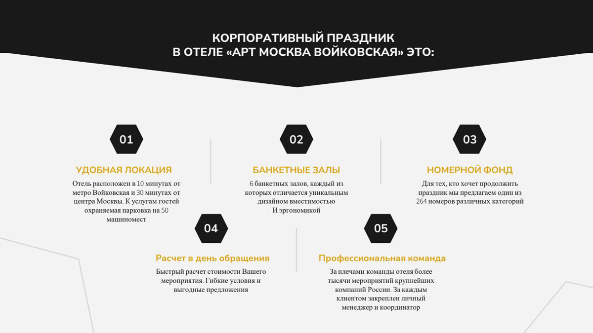 Это прекрасный повод не только выстроить комфортную и неформальную коммуникацию между сотрудниками, но и в удобном формате и приятной атмосфере подвести итоги, озвучить планы на будущее, отметить сотрудников, наиболее отличившихся за этот период. Команда отеля «Арт Москва Войковская» приглашает Вас отпраздновать новогодний корпоратив в наших банкетных залах.