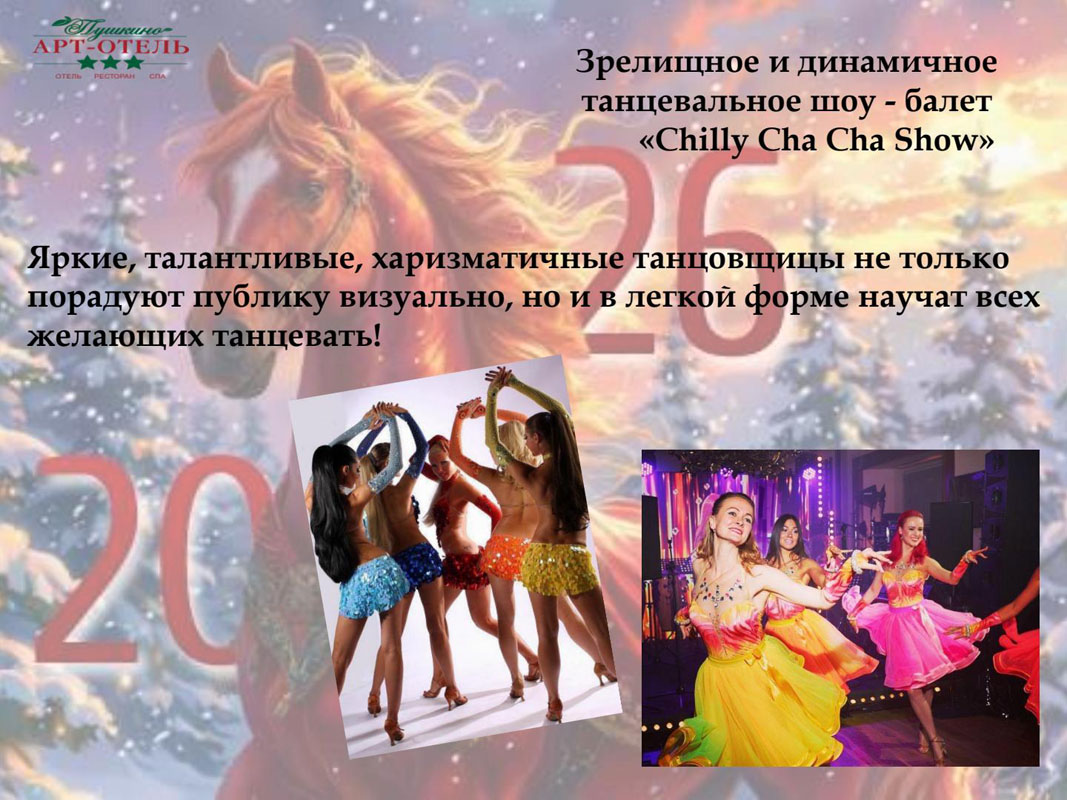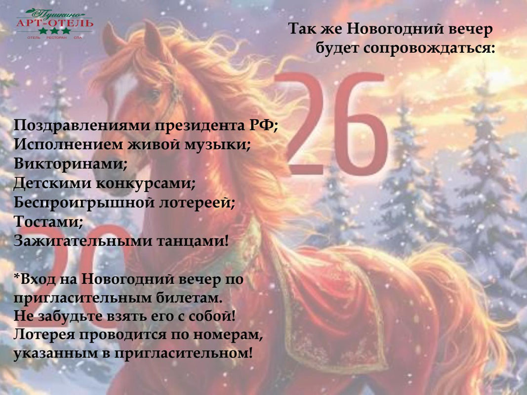Мы приглашаем вас в зимнюю сказку Подмосковья, где, забыв о городской суете, вы будете ЗАЖИГАТЬ НОВЫЙ ГОД КРАСНОЙ ОГНЕННОЙ ЛОШАДИ!