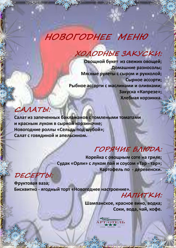 Мы предлагаем красивые отдельные залы, отличное праздничное меню, выступления музыкантов и вокалистов и шикарную новогоднюю программу.