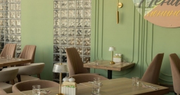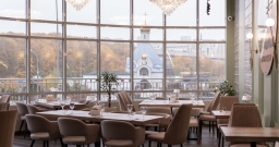 Просторный зал с панорамными окнами, гибкая рассадка, столы объединяются