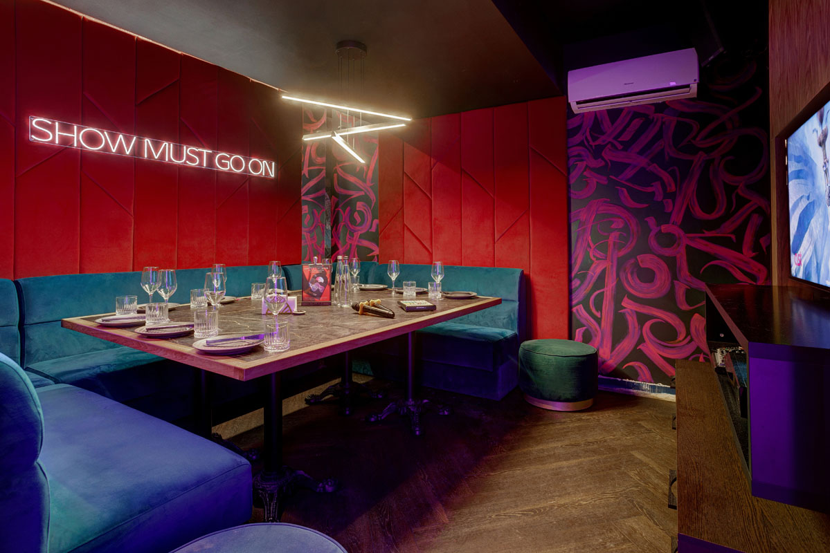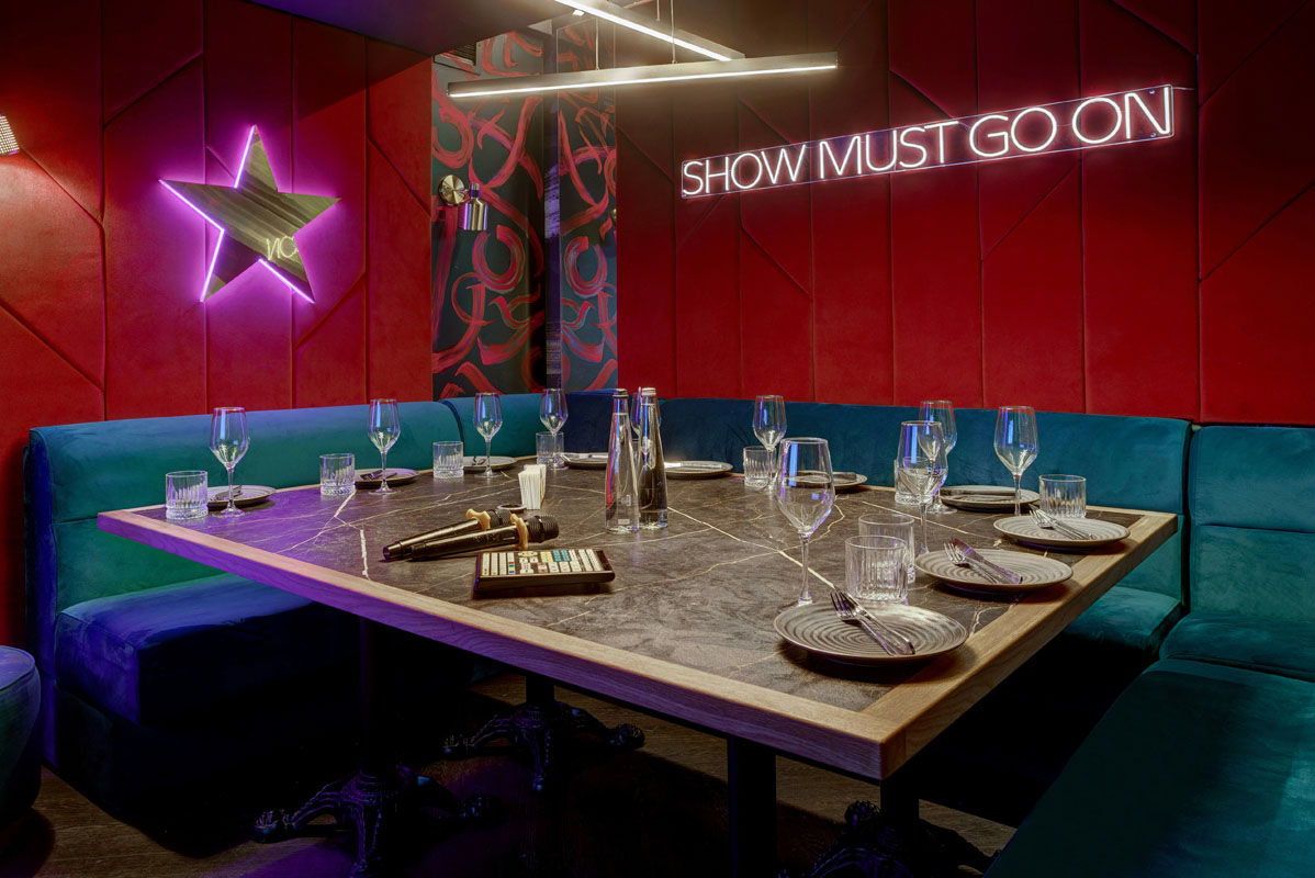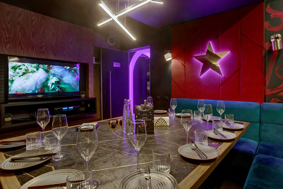 К вашим услугам просторный общий зал со сценой и 8 VIP-залами караоке на компании от 6 до 20 человек.